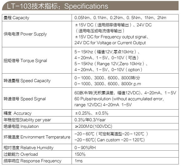 LT-103 微量程扭矩传感器适用于主要应用于微量程(2Nm 以下)扭 矩的测量。当扭矩测量值小于 2Nm 时,旋转体支撑轴承的磨擦力矩 就成了不可忽略的干扰因素。LT-103 型采取应变区和供电、发射区 分开布置,使应变区避开轴承的影响,有效的改善和提高了扭矩传感 器的抗过载能力及测量精度。